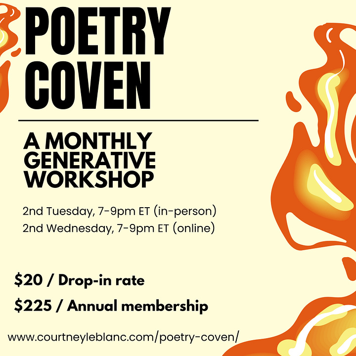In 2026 I’m taking a (short) break from teaching workshops as I am a little burnt out. But I’m still leading my monthly Poetry Coven, the generative writing workshop I host. Read more about it here and I hope to see you at a future Poetry Coven! We kick off the new year of Poetry Coven on 13 January!